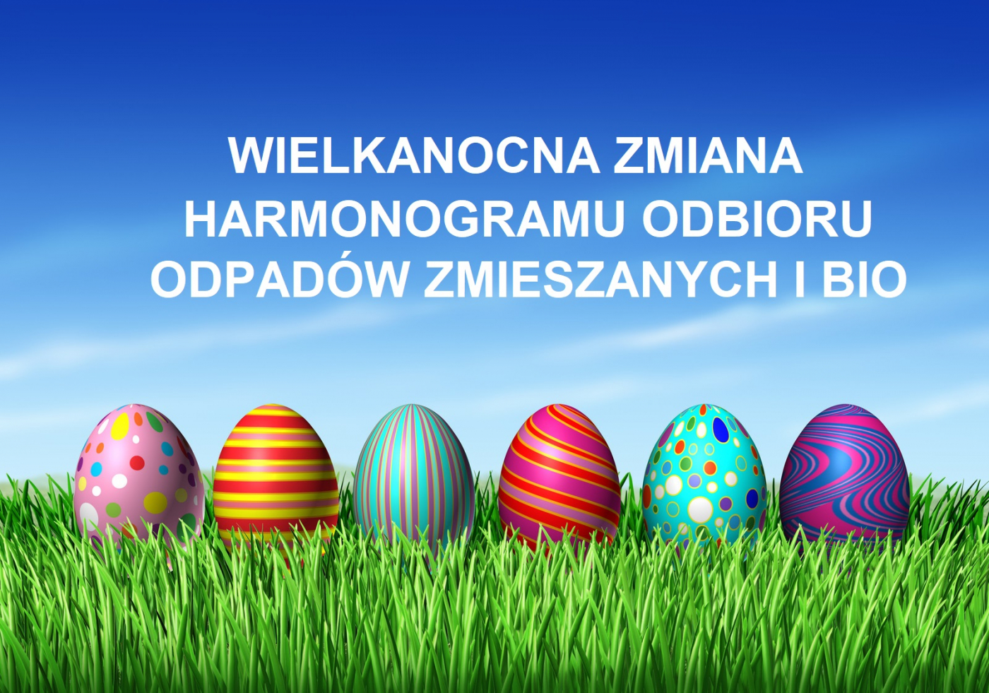 Informujemy, że w związku z dniem wolnym, który przypada w wielkanocny poniedziałek zmienia się harmonogram odbioru odpadów zmieszanych i BIO. Zmiany będą dotyczyć wywozu w dniach 19-23 kwietnia 2022 r.