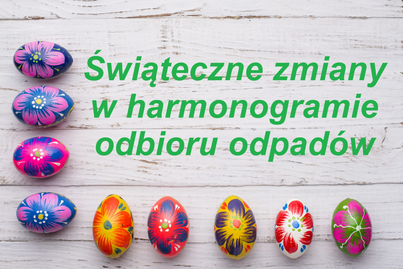 Z uwagi na dzień wolny przypadający w drugi dzień świąt Wielkiej Nocy, tj. 5 kwietnia 2021 roku, zmienia się harmonogram odbioru odpadów. Zmiany dotyczą tylko tych miejsc, w których jesteśmy w poniedziałek, wtorek i środę. Odbiór odpadów w czwartek i w piątek odbędzie się zgodnie z planem.