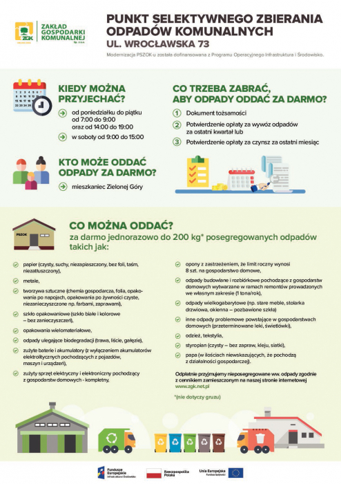 - zapewnienia kompleksowości systemu gospodarowania odpadami komunalnymi poprzez uzupełnienie istniejącego systemu i zapewnienie dostępu wszystkim mieszkańcom miasta Zielona Góra do PSZOK, który – zgodnie z obowiązującymi przepisami – zapewniać ma przyjmowanie m.in. takich odpadów komunalnych jak: przeterminowane leki i chemikalia, zużyte baterie i akumulatory, zużyty sprzęt elektryczny i elektroniczny, meble i inne odpady wielkogabarytowe, zużyte opony oraz odpady budowlane i rozbiórkowe stanowiące odpady komunalne, zgodnie z zapisami ustawy o utrzymaniu czystości i porządku w gminach
